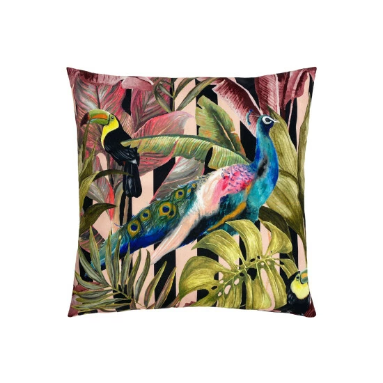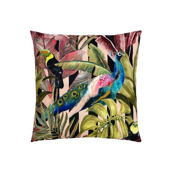 Add drama to your garden with a striking jungle themed cushion. This cushion captures a Toucan and Peacock on a backdrop of tropical leaves and flowers in their bright and natural colours, which makes it a beautiful addition to any home.