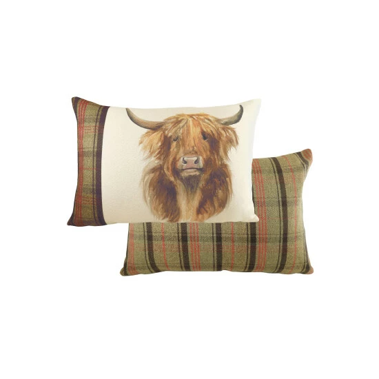 The Hunter cushion brings a modern twist to a country-inspired design. With a hand-painted highland cow accompanied by a panel matching tartan this would be a great addition to any home thats looking to add some character. This is the perfect fit for any neutral or country inspired theme.