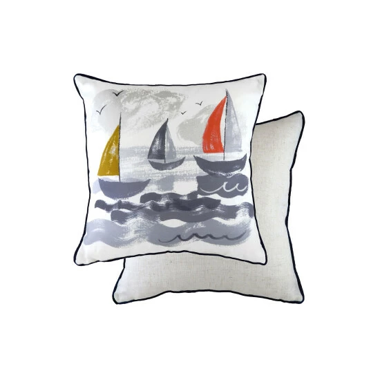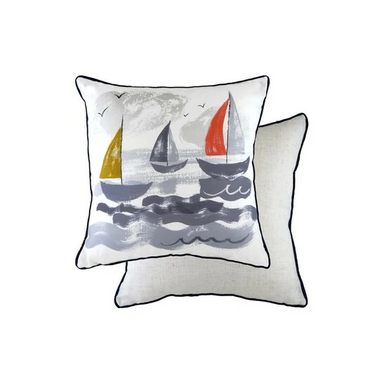 Escape to the seaside with this nautical style cushion. With a soft and plain background this cushion really brings the colours and the scene to life. The contemporary and playful nature of this design means it would fit perfectly into a range of home settings and especially with contemporary interiors or nautical schemes. This cushion gives you that little bit extra with a contrasting piped edge and linen look reverse.
